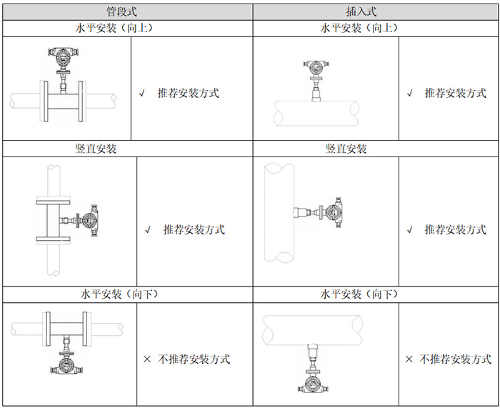热式气体质量流量计可以在水平、 垂直或倾斜管道上安装,在管道圆周方向上可任意角度安装,但要考虑操作、维护的方便。对于较脏或潮湿气体,为了减少对传感器污染的可能性,建议水平安装(向上)流量计。传感器的安装位置要避开管道最低处,防止管道内积水使流量计无法正常工作。